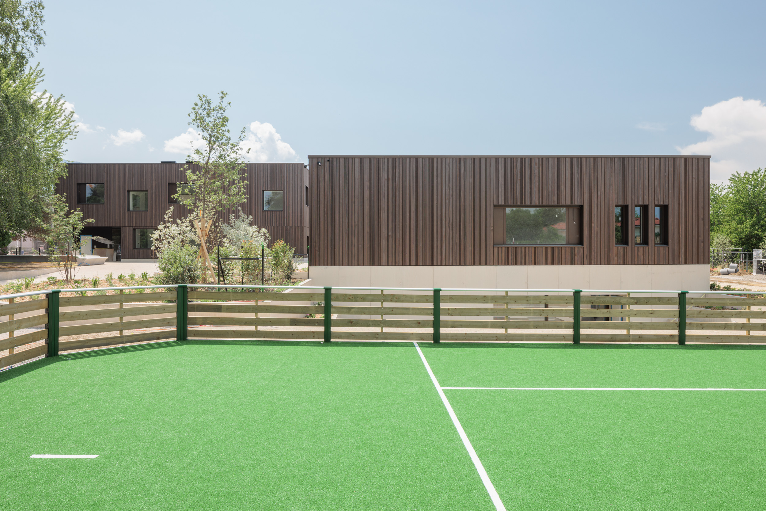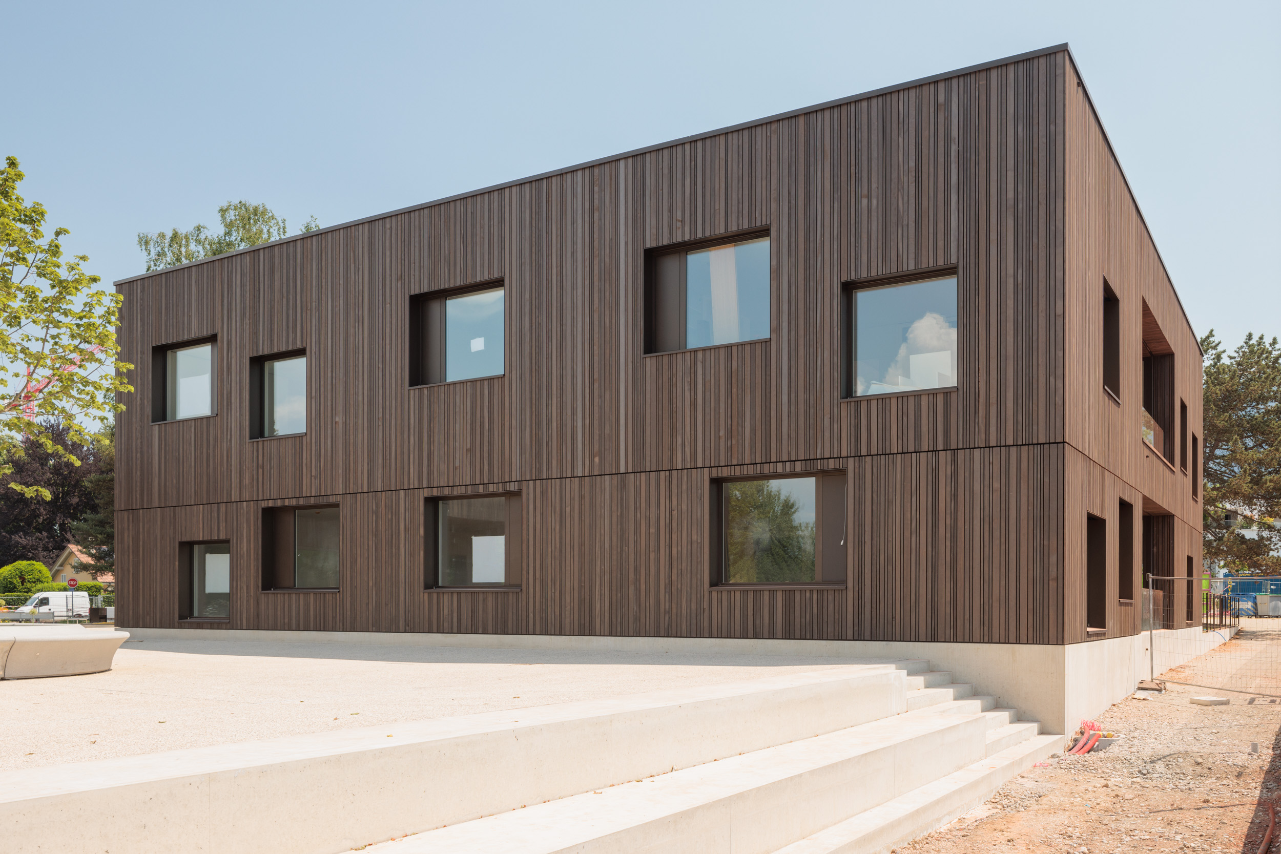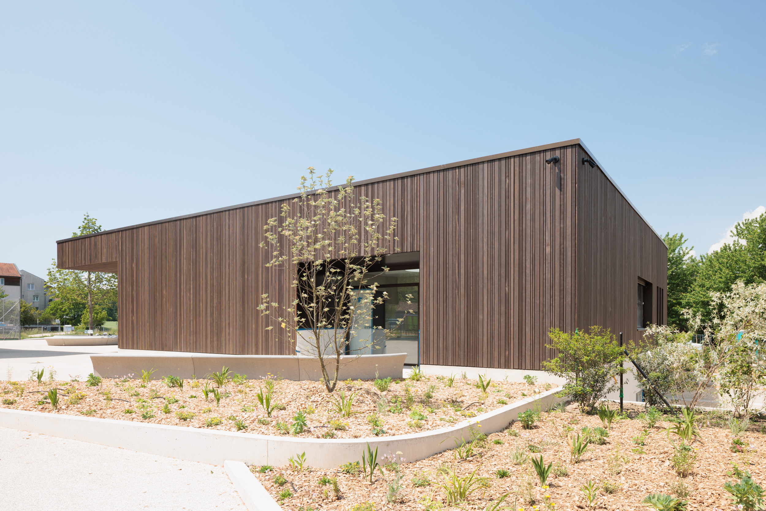 • Revêtement extérieur ventilé avec lames bois, finitions en tôles aluminium thermo-laquées
