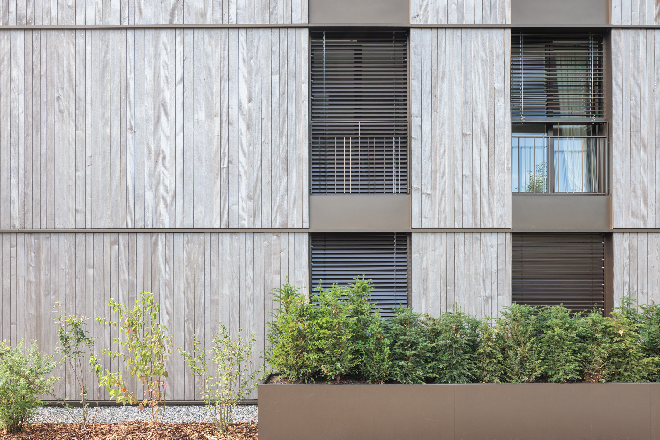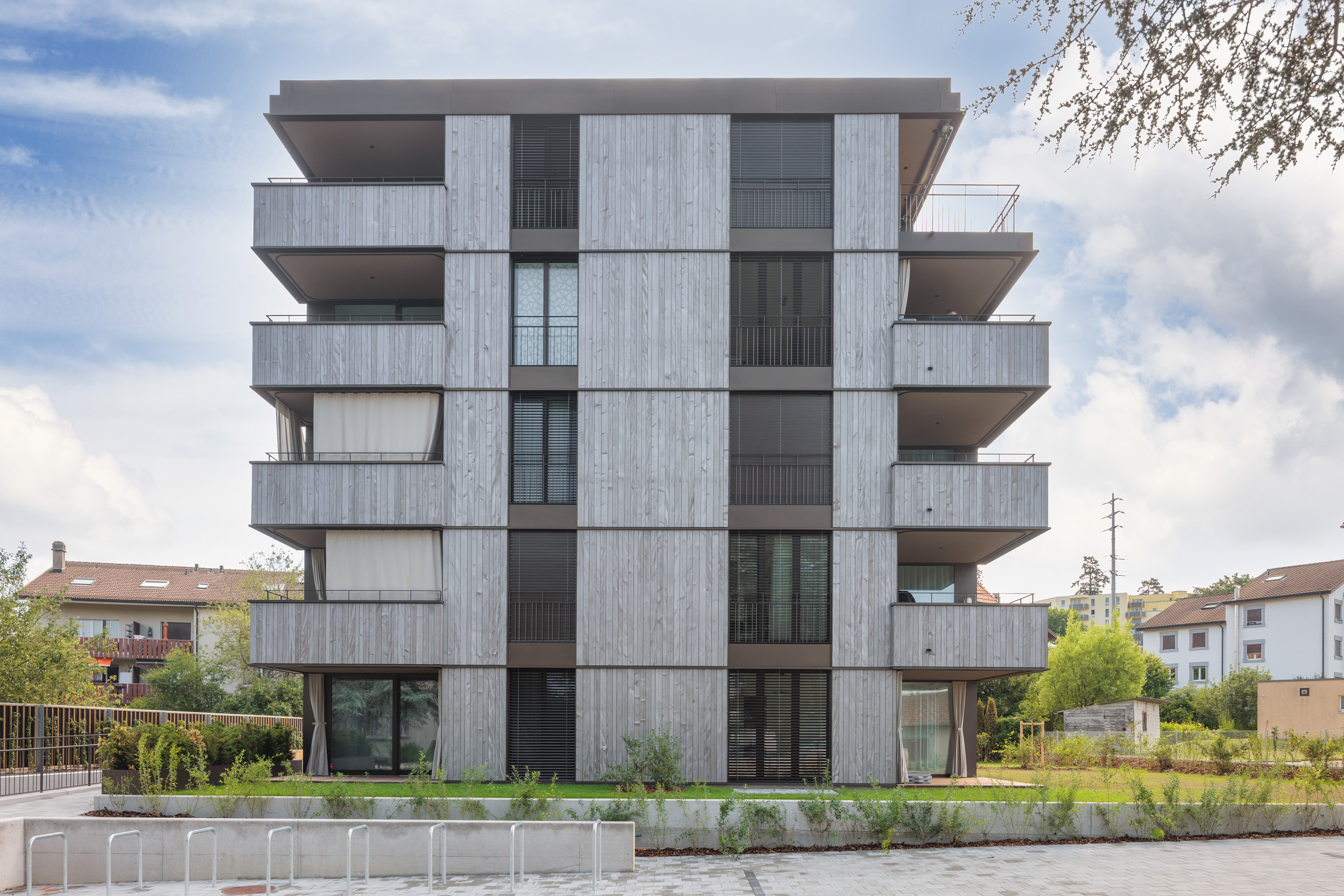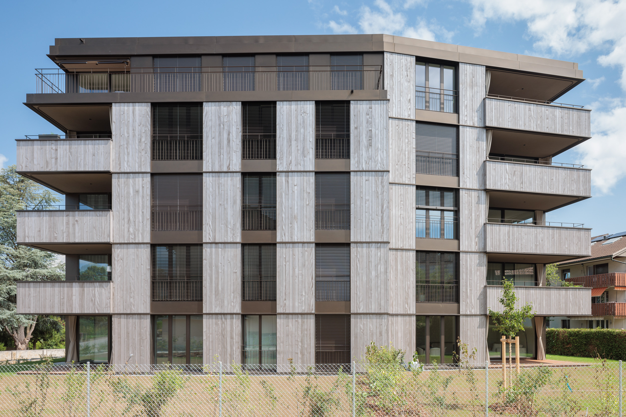 • Revêtement extérieur ventilé avec lames bois, finitions en tôles aluminium thermo-laquées