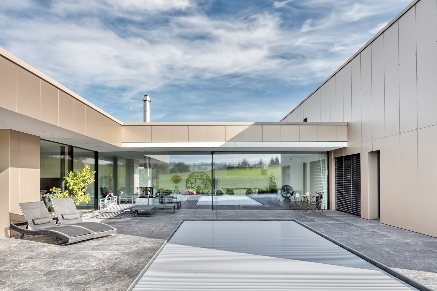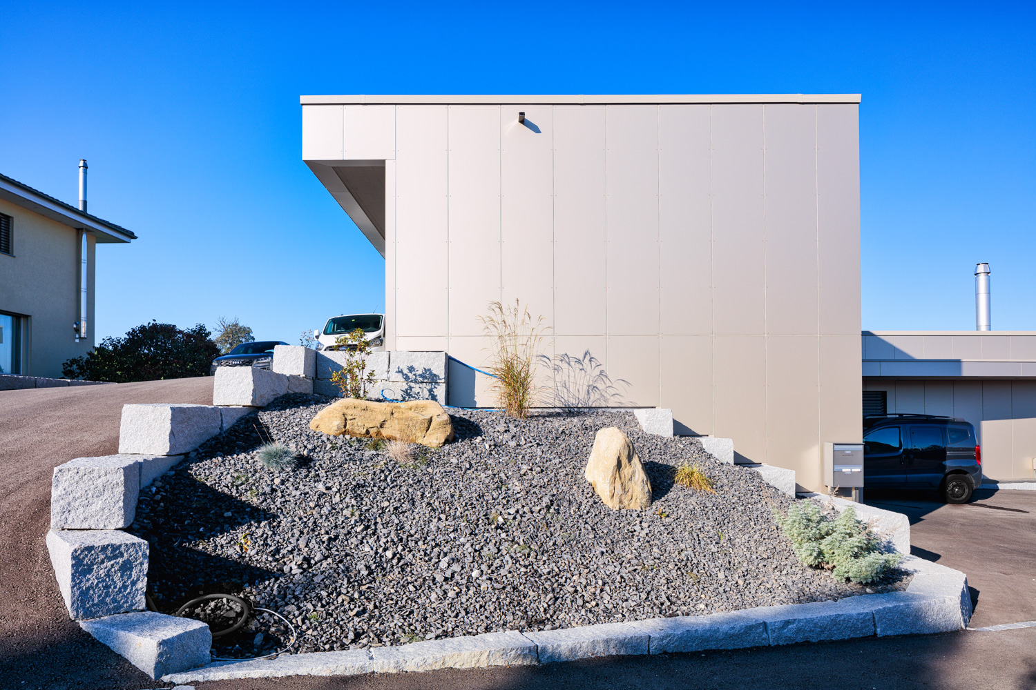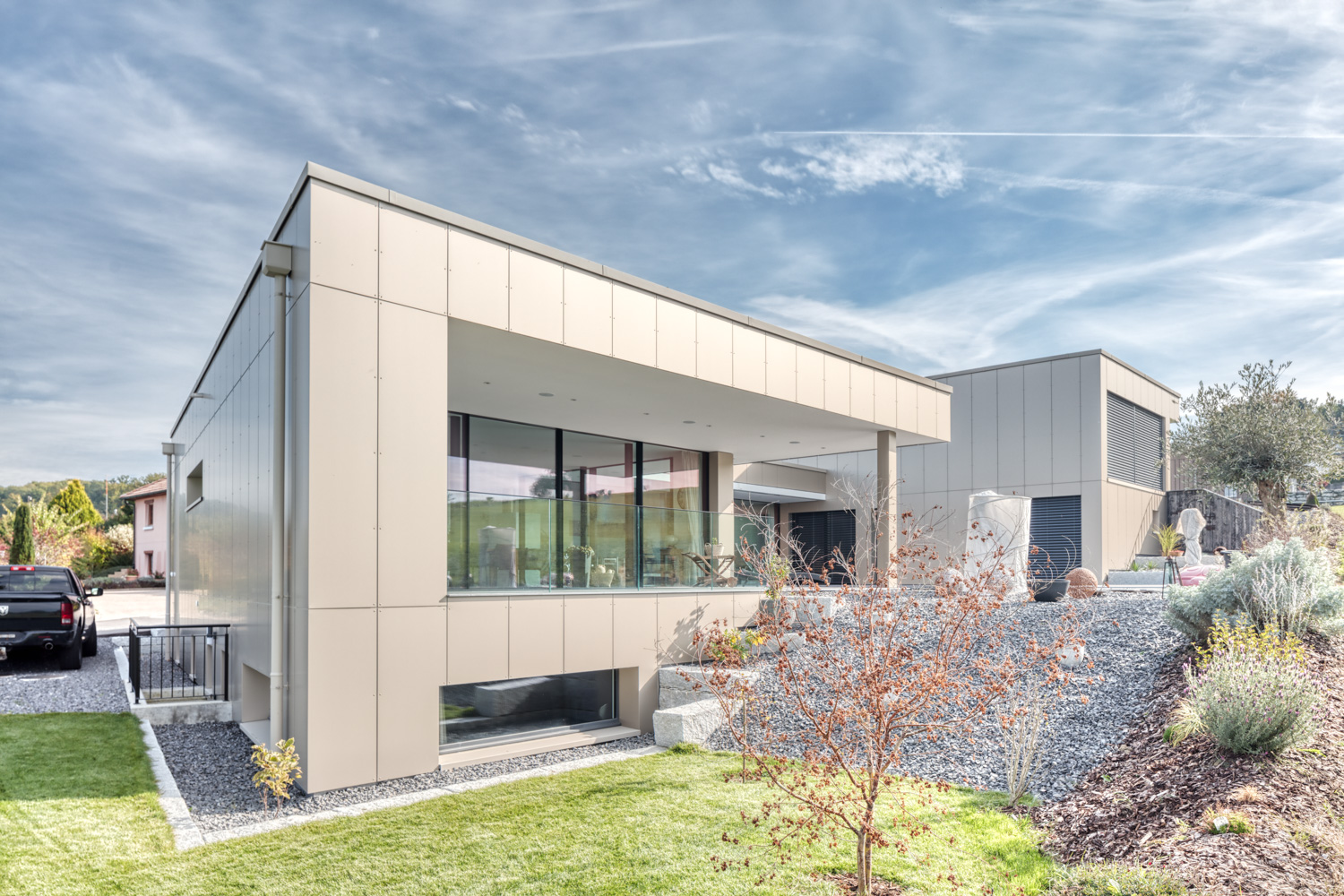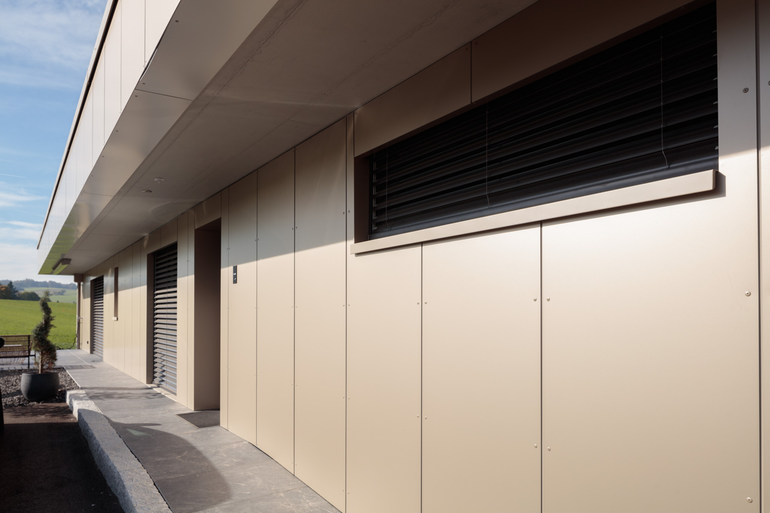 • Façade en panneaux composites, fixations visibles, plaques planes